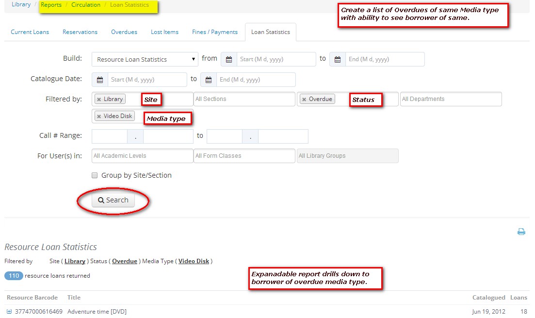 for example, to create a list of overdue DVD/Videos, follow the screen shot below: