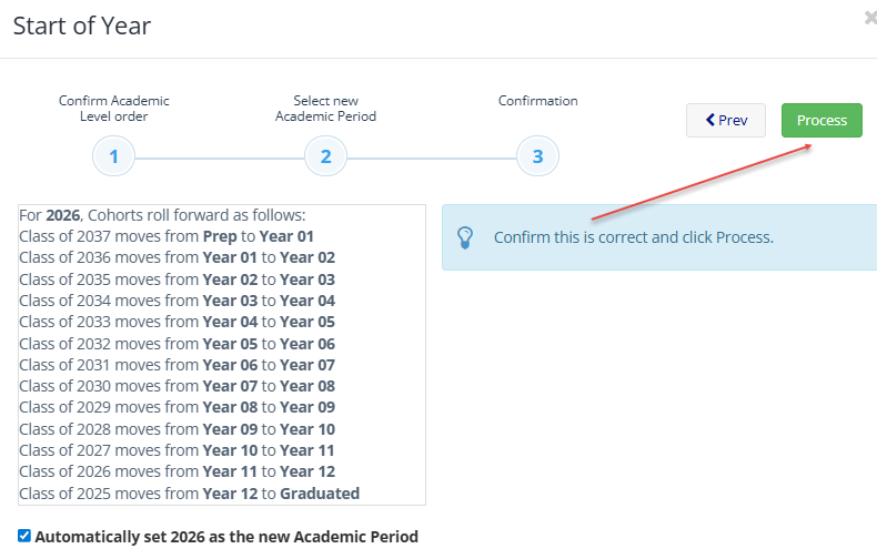 At the beginning of each school year you must rollover your students into their new Academic Levels (Year Level), set the new Academic Period, and add the newest Cohort before importing any students or form classes. This process can be run as the last process of the outgoing year, or the first process of the incoming new year.