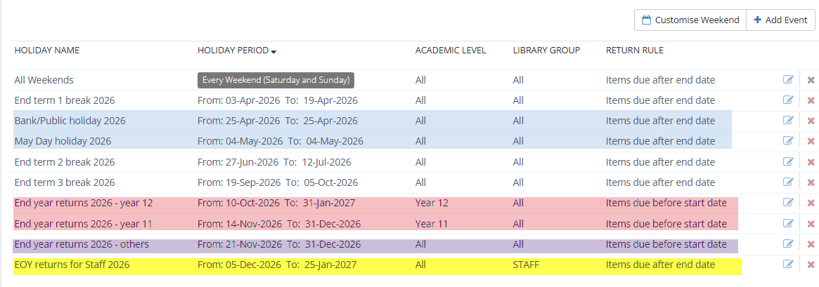 to set up a period of one or more days when your library will be closed:- Record Name of holiday period, e.g., Semester 1 Break, or Year 12 EOY, or Staff